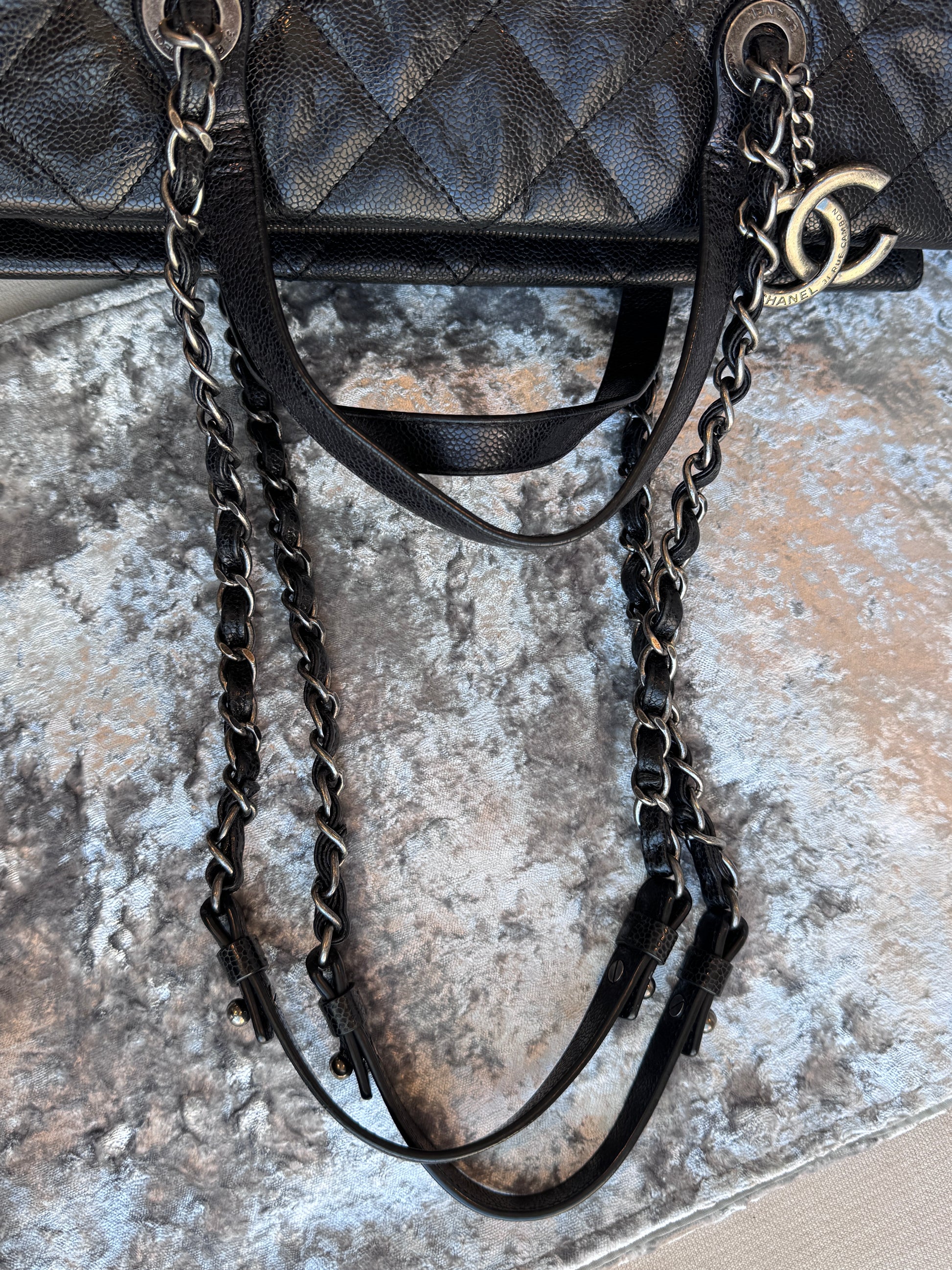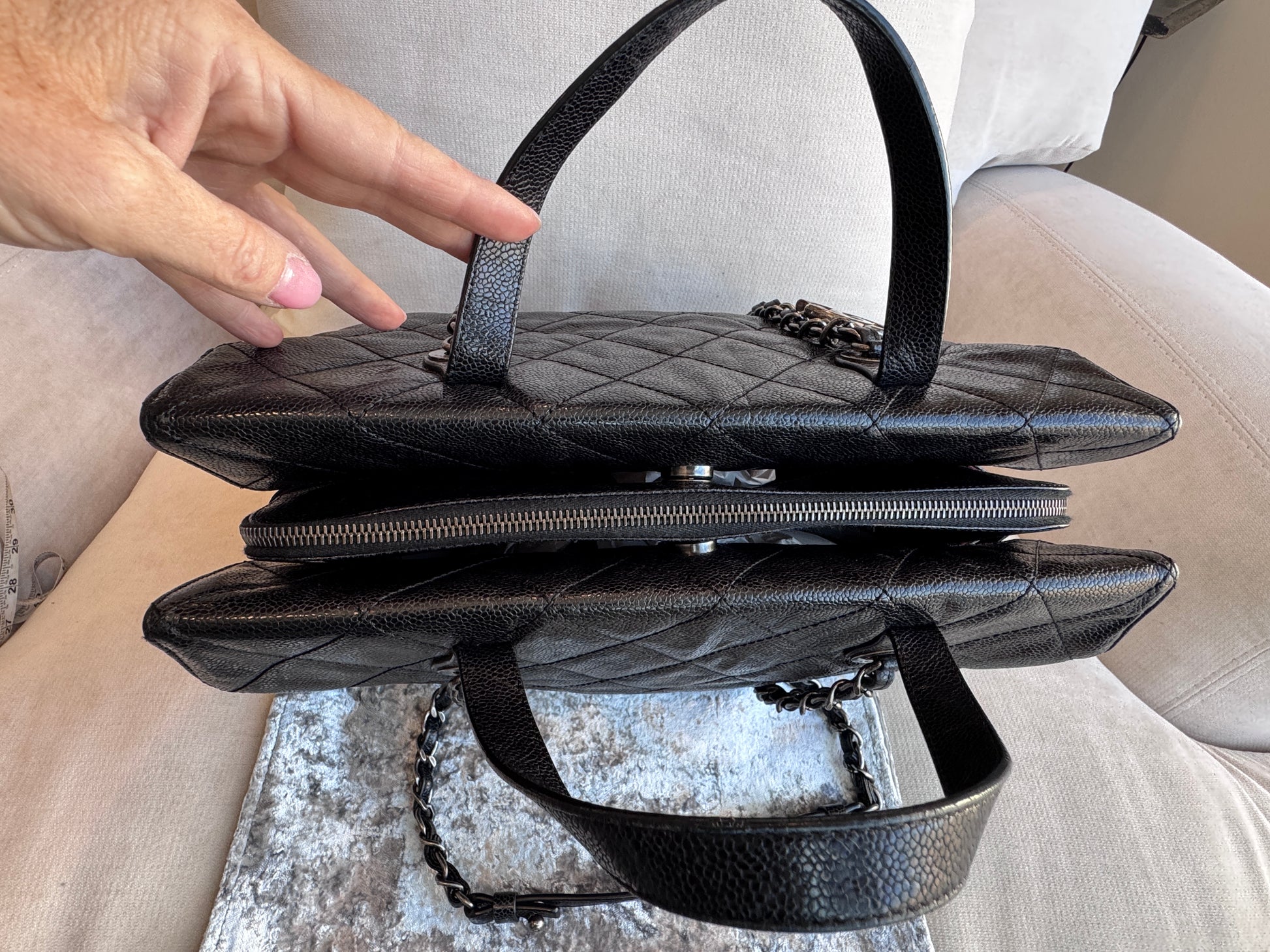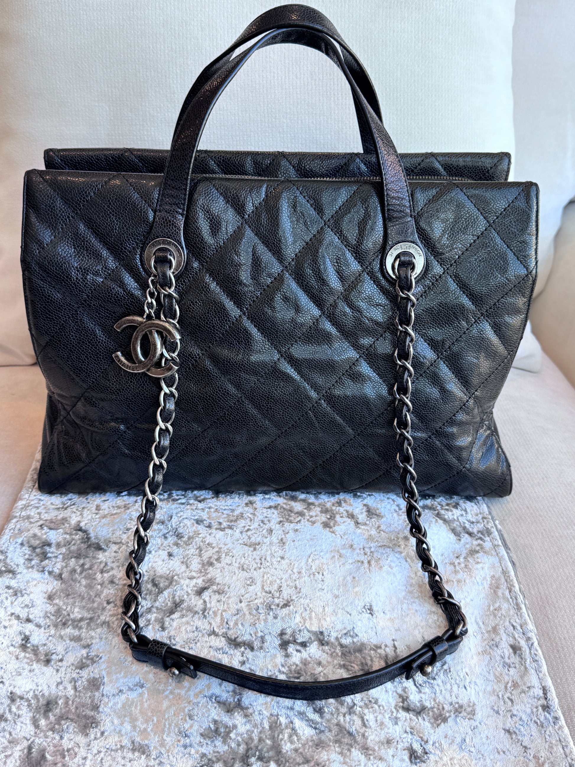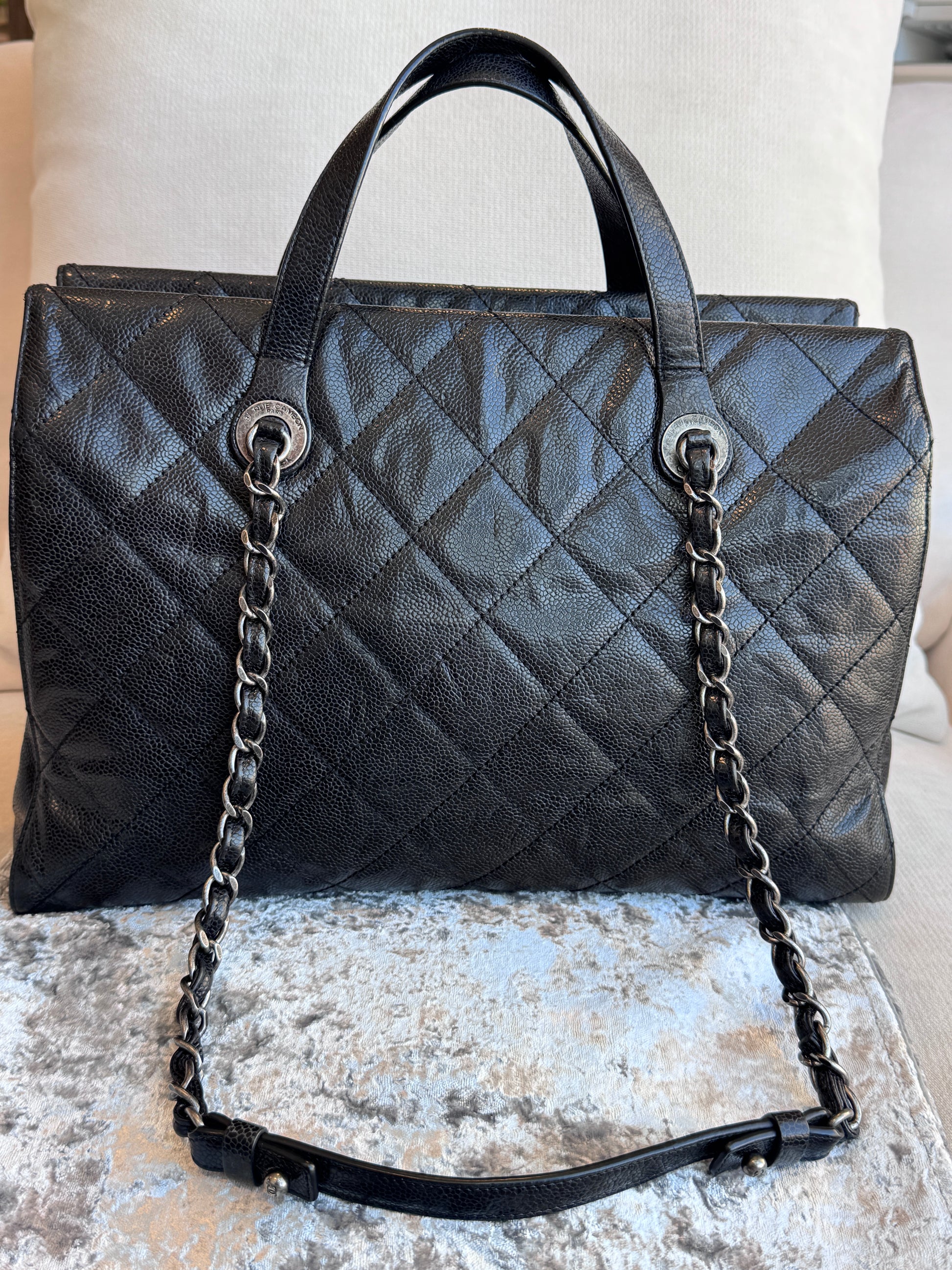 Straps: Dual chain and leather shoulder straps with leather shoulder straps in excellent condition. Leather remains smooth and intact.