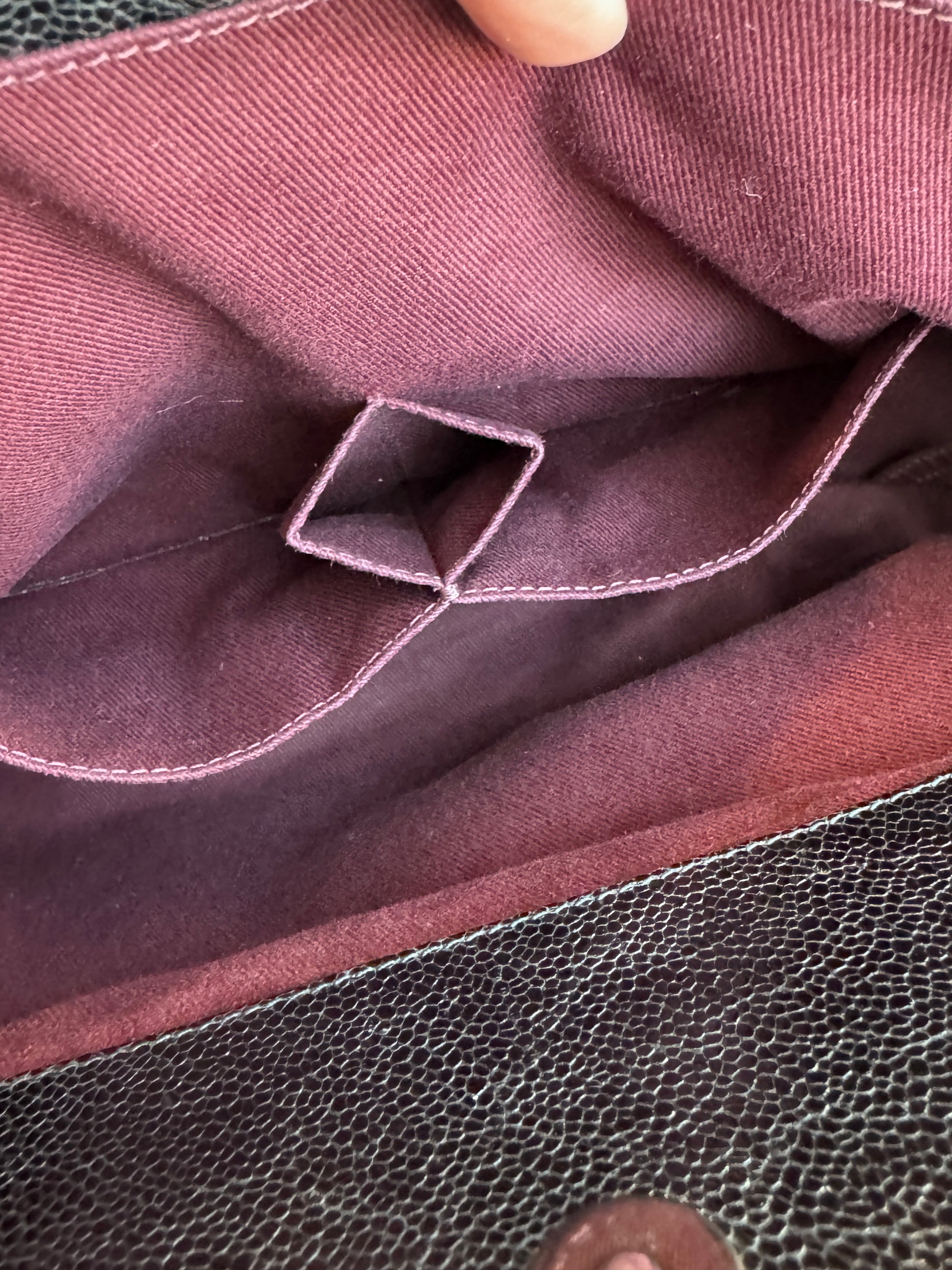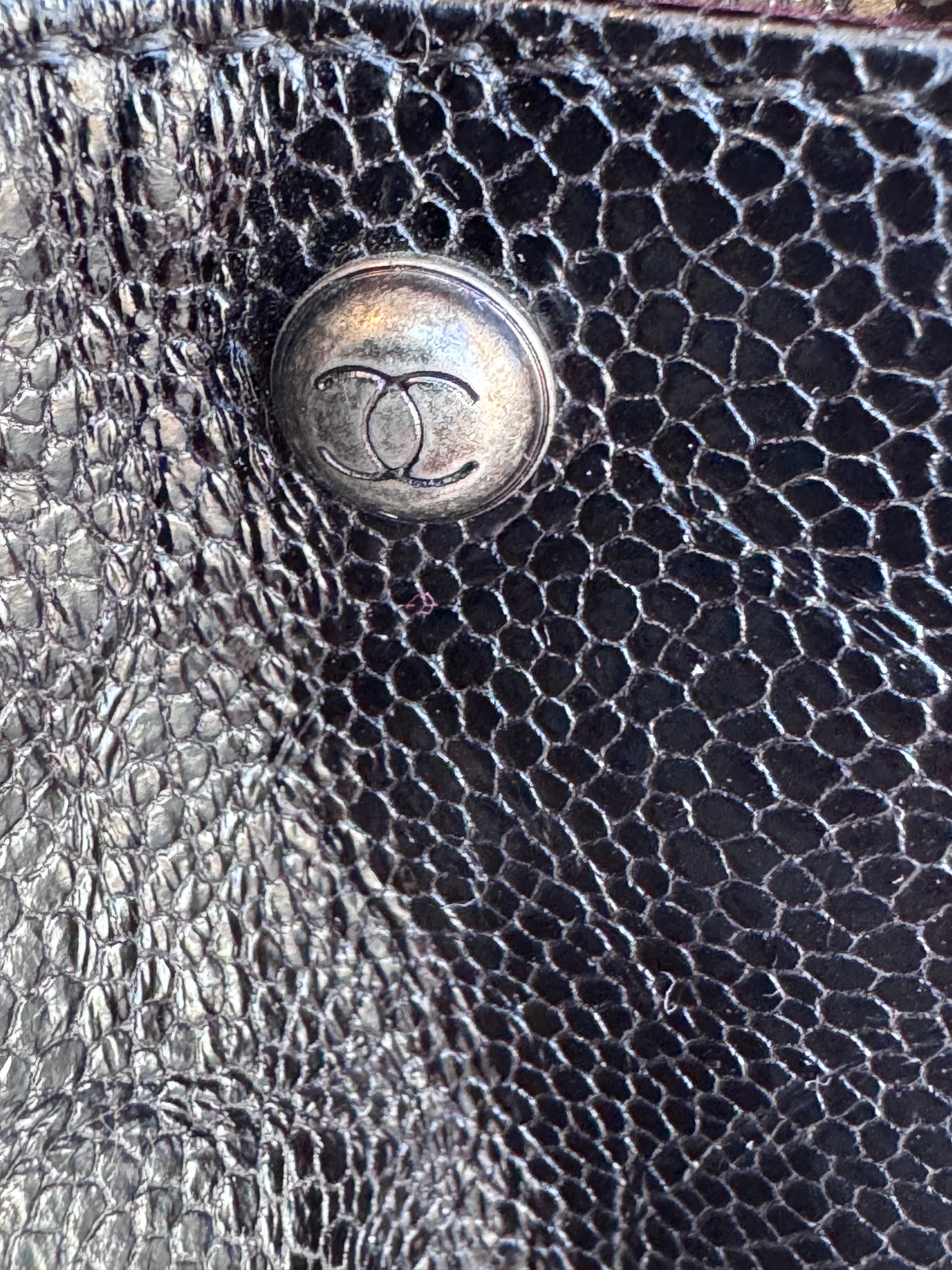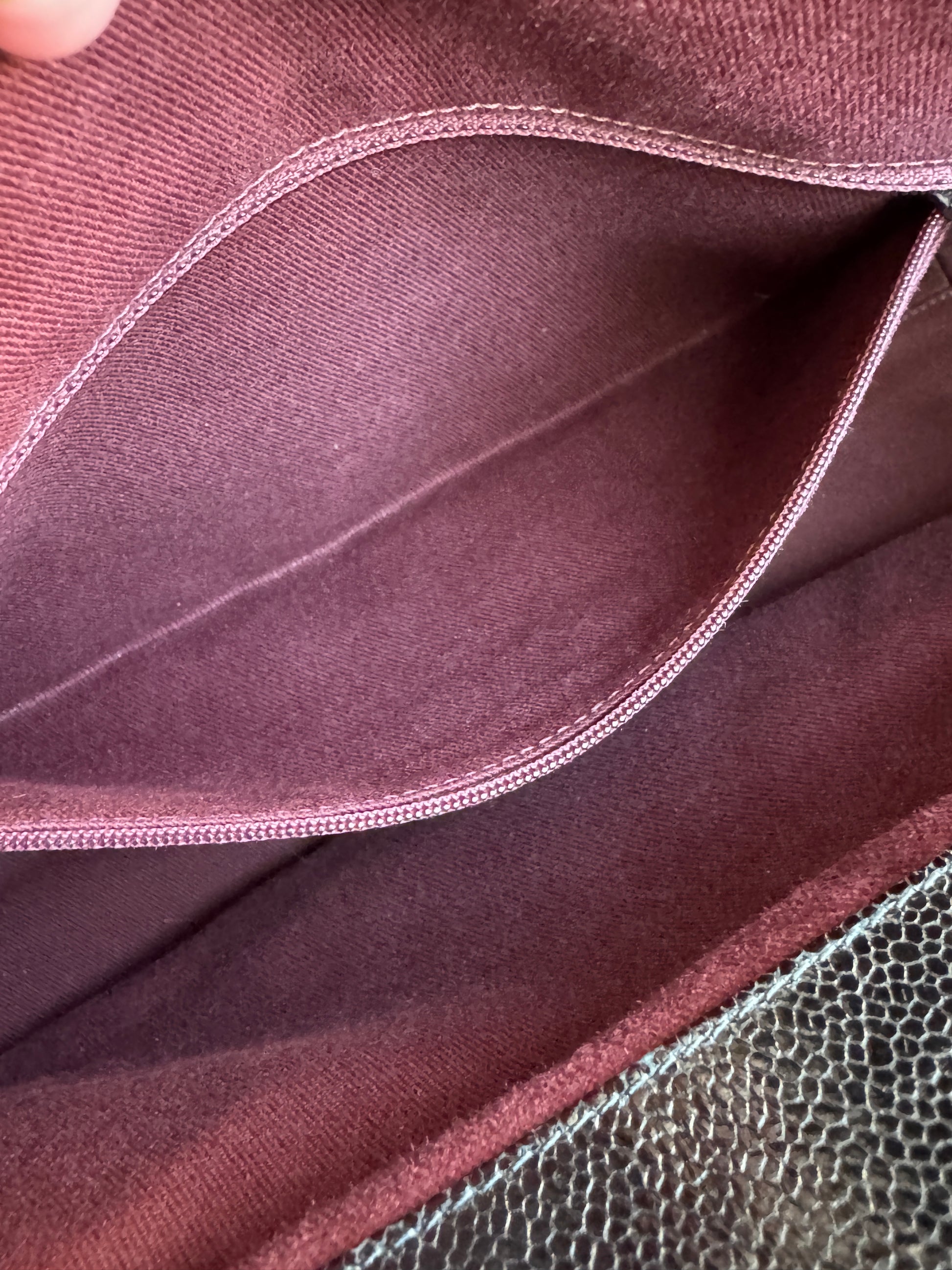 Exterior Leather: Excellent overall condition. Glazed caviar leather remains supple with vibrant color and structure. Light natural creasing consistent with normal gentle use. No major flaws or heavy wear observed.