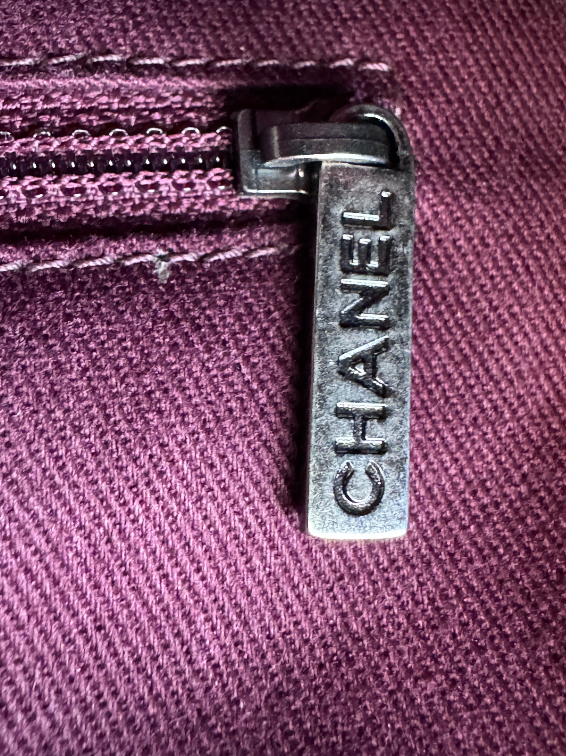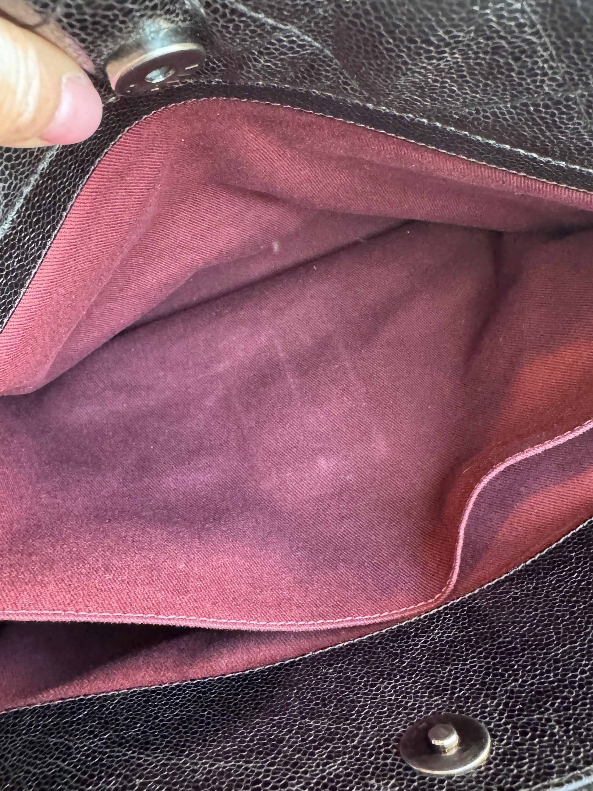 Hardware: Antique ruthenium hardware with light surface wear consistent with normal use. Chain straps, grommets, zipper, snaps, and charm are fully functional.