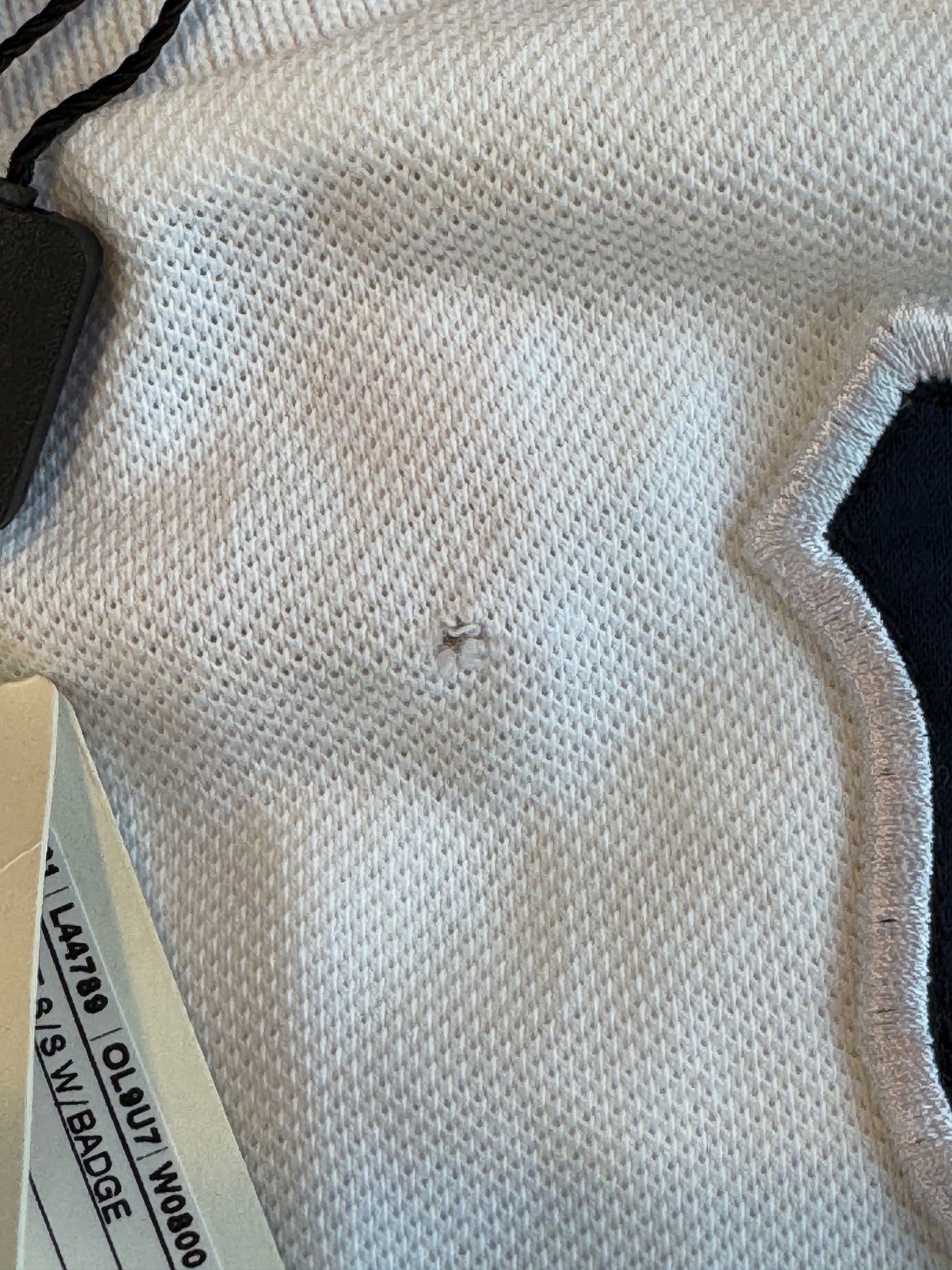 This is unworn with tags. It has a tiny hole on the front by patch (could easily be repaired). See Photos. No stains. No odor.