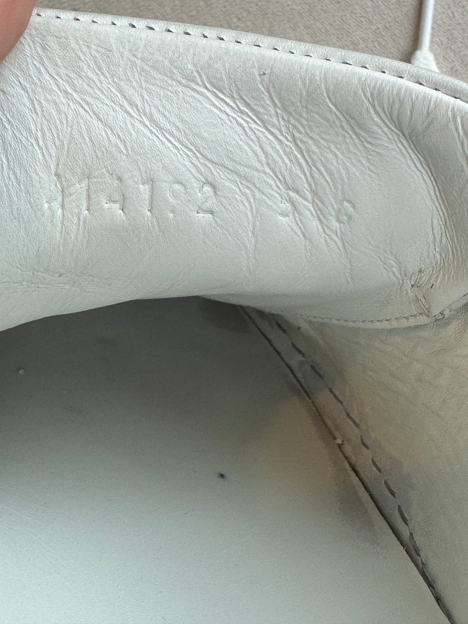 - Leather: Overall still stiff and clean white. Creasing, scuffs, marks. Heels have some fading, but good overall