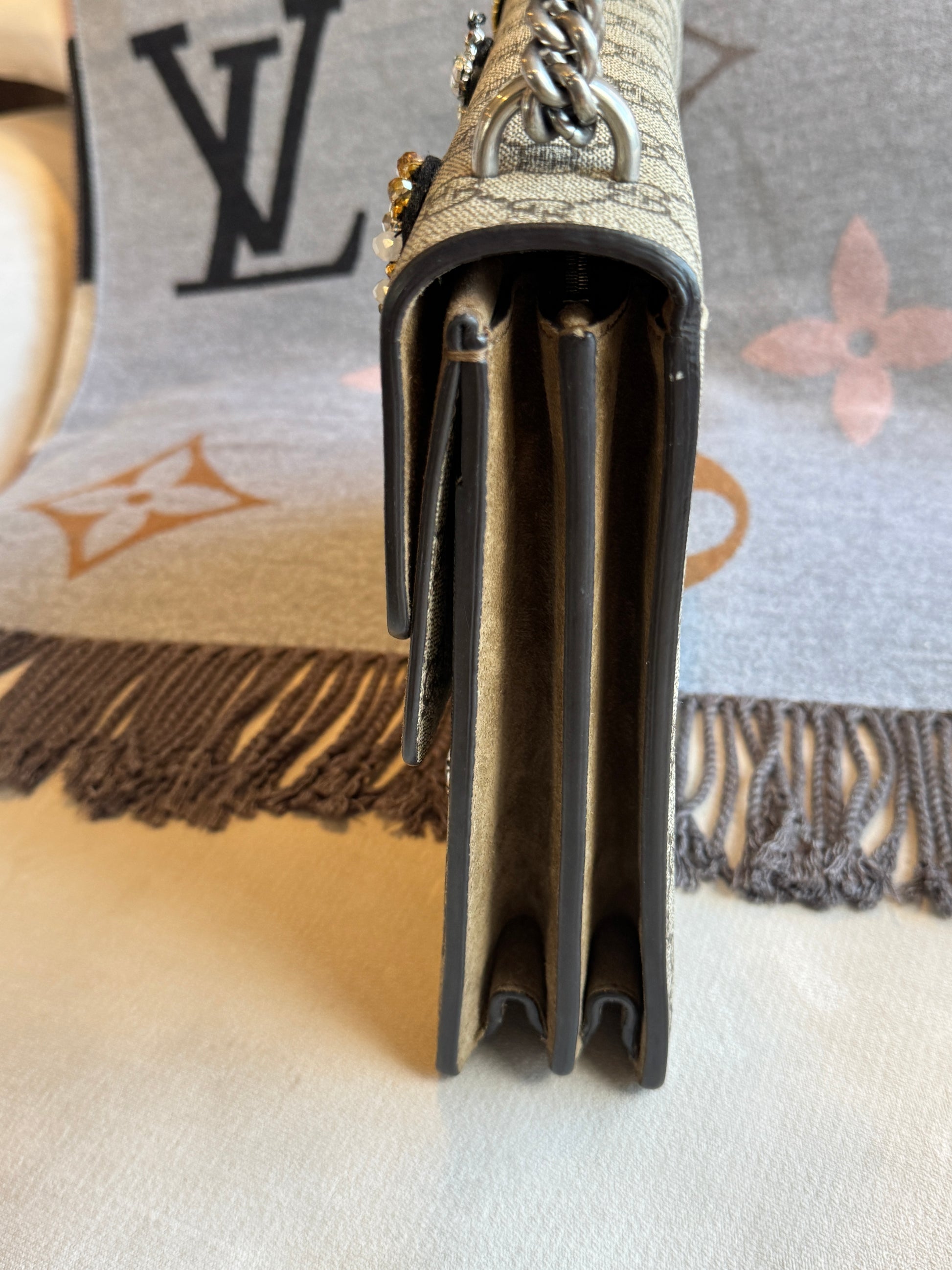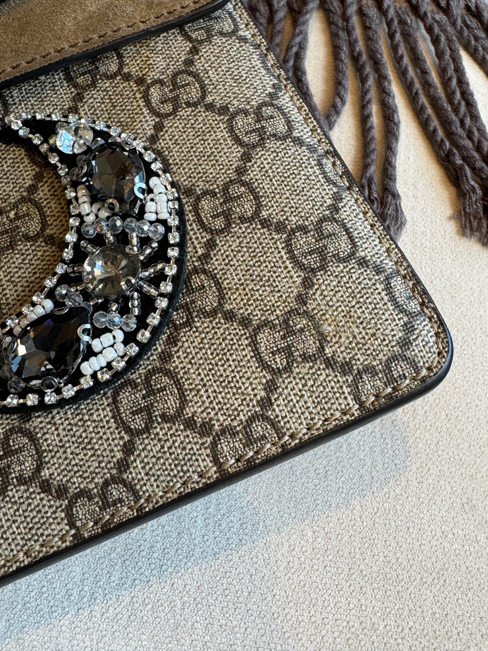 This gorgeous bag has never been used. It previously had some beaded patches on the front. All original embellishment was removed and replaced with non-branded embellishments. Otherwise the rest of the bag is in excellent condition. Inside, corners, hardware all in excellent condition. Everything works properly. See photos for the areas where patches/embroidery were and some faint spots. There may be some loose threads still present on the front canvas.
