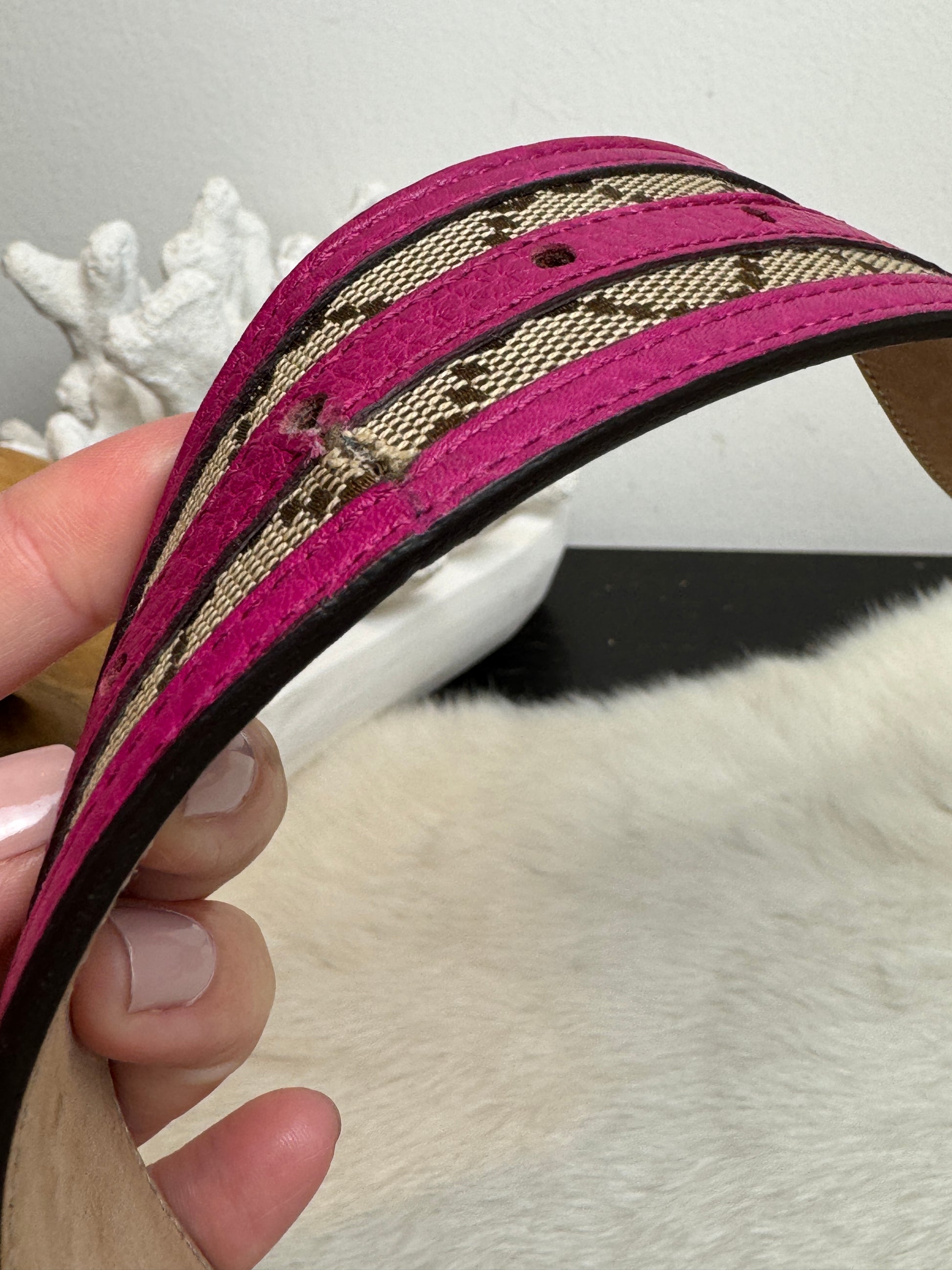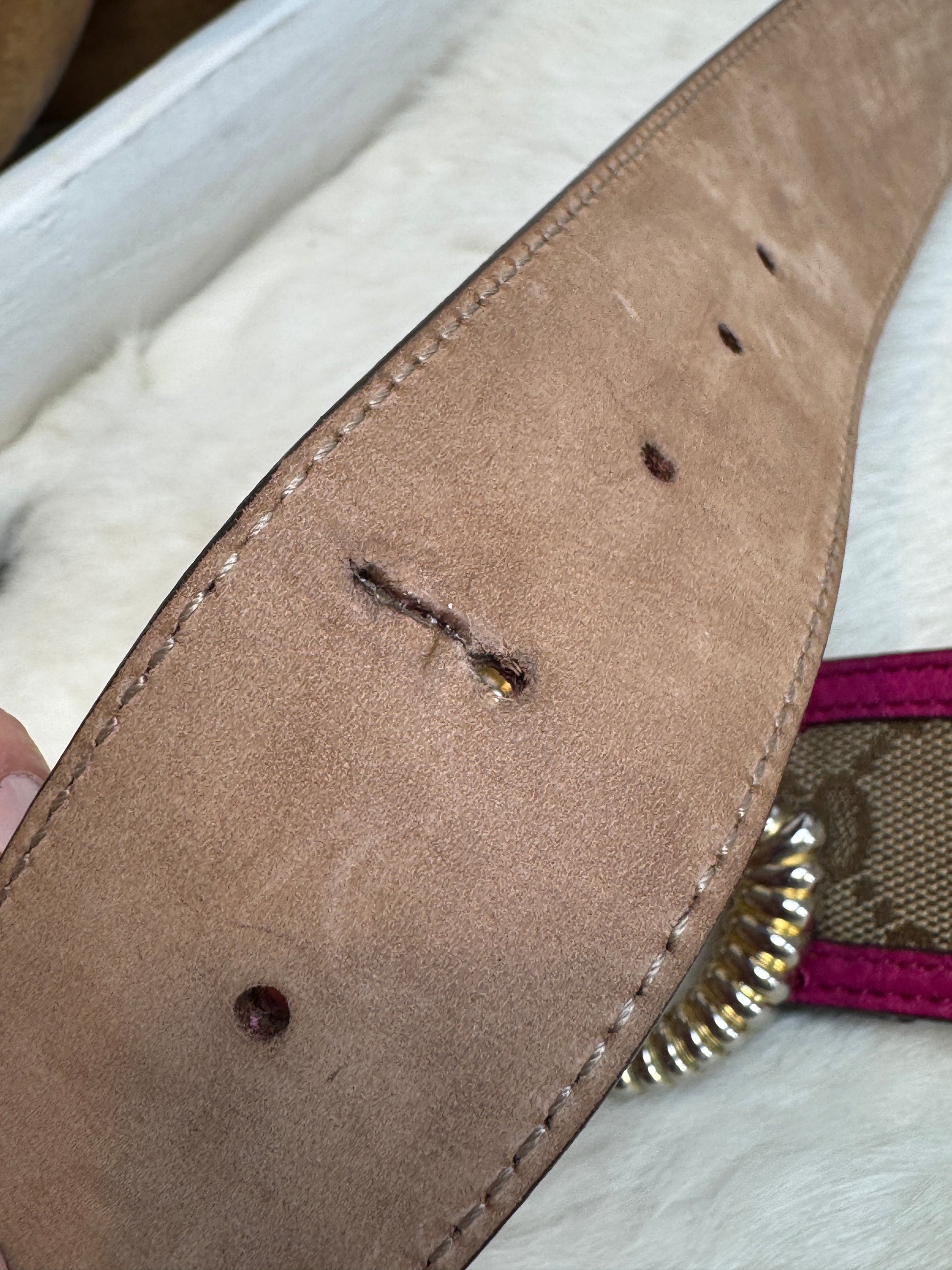 Hardware: The buckle is authentic replacement (with certificate of authenticity). Has some fading and surface scratches.
