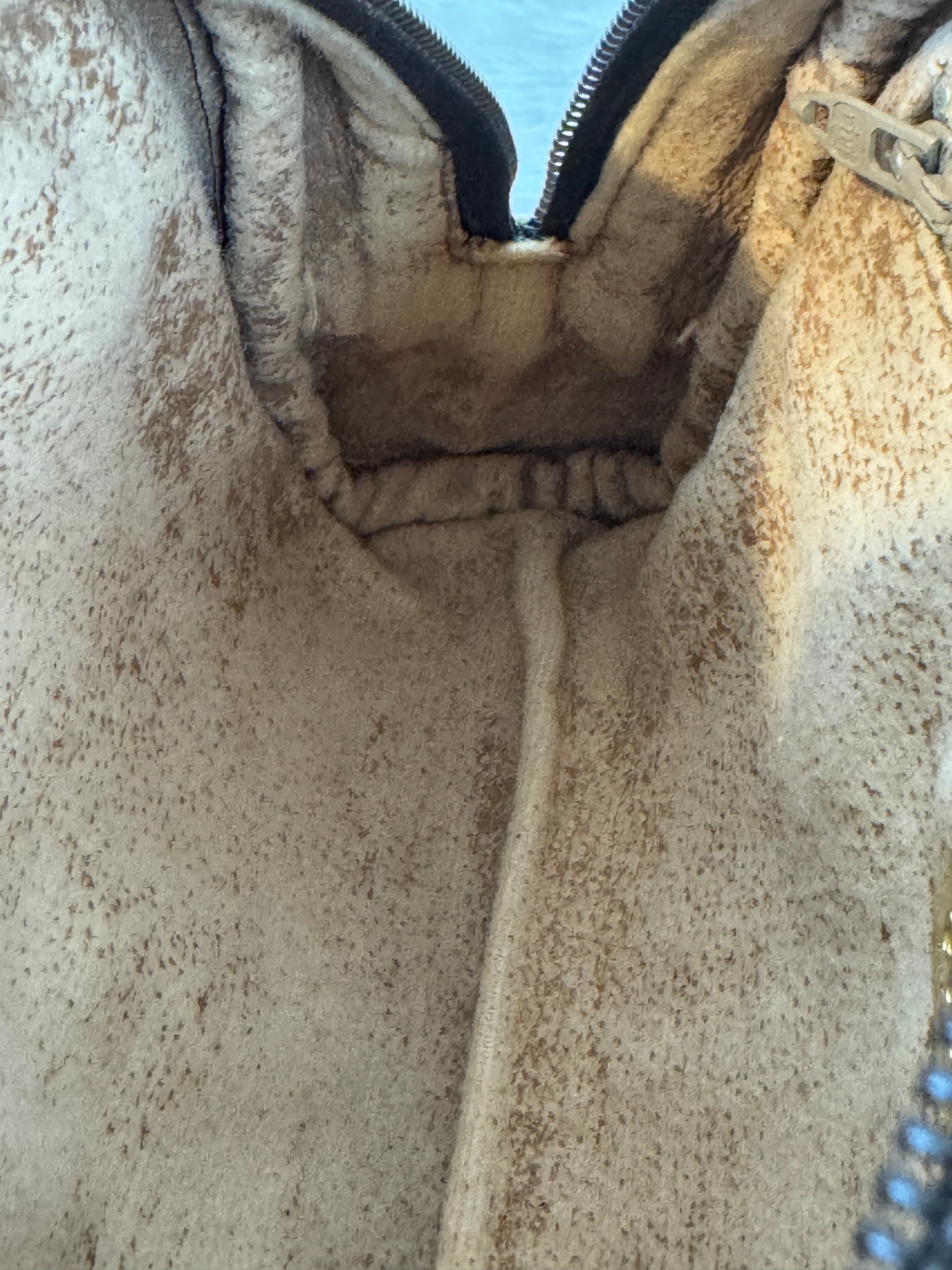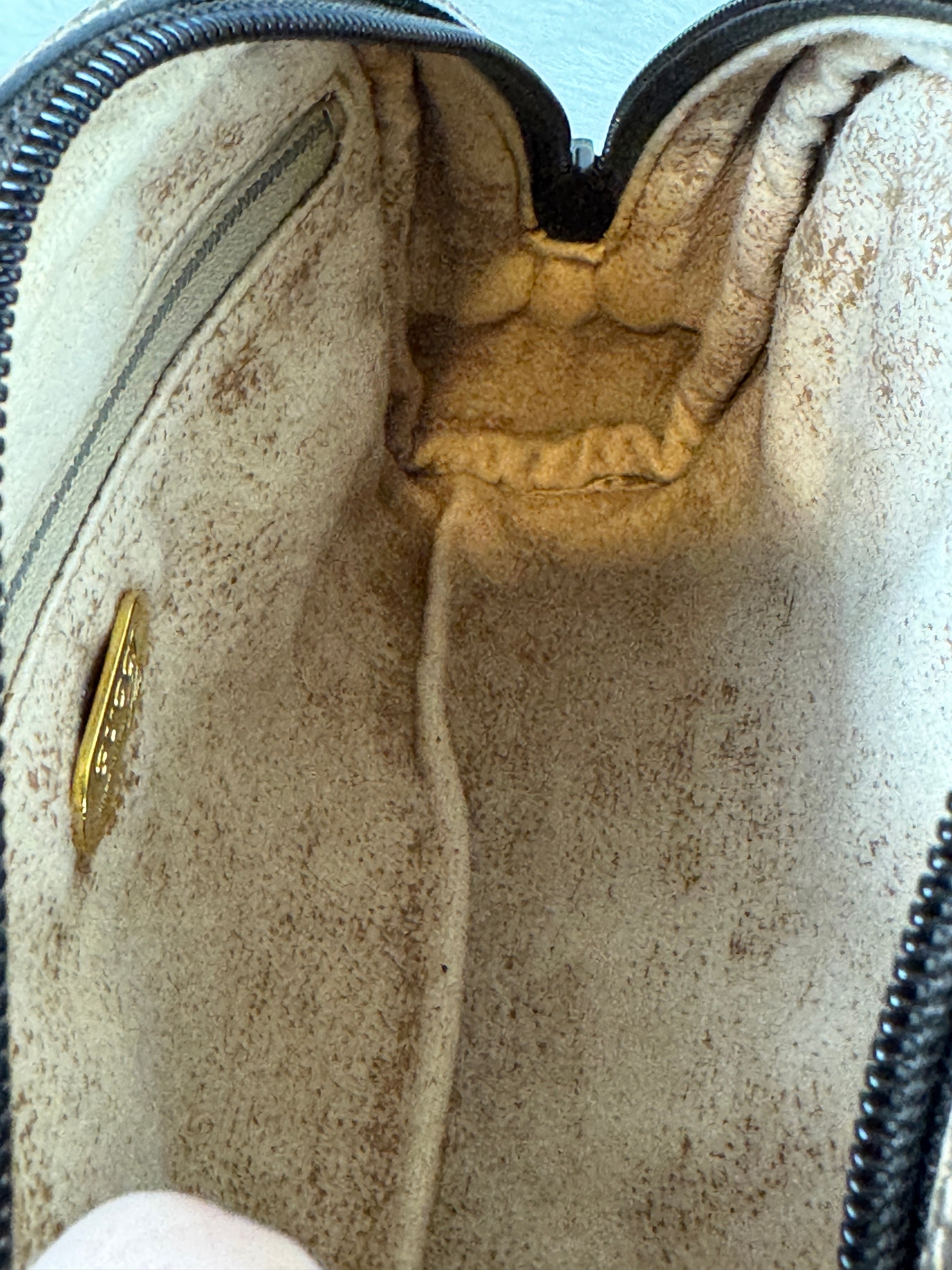 Overall good vintage used condition. Canvas is clean and vibrant, piping is good with some minor rubbing/fading from age and use. Zipper works properly and runs smooth. Some hardware scratches and fading. Strap connections are strong. Chain strap is a replacement. Interior is very clean, no pens stains. The lining is soft fabric and faded in some areas only. Minor vintage smell 3/10.