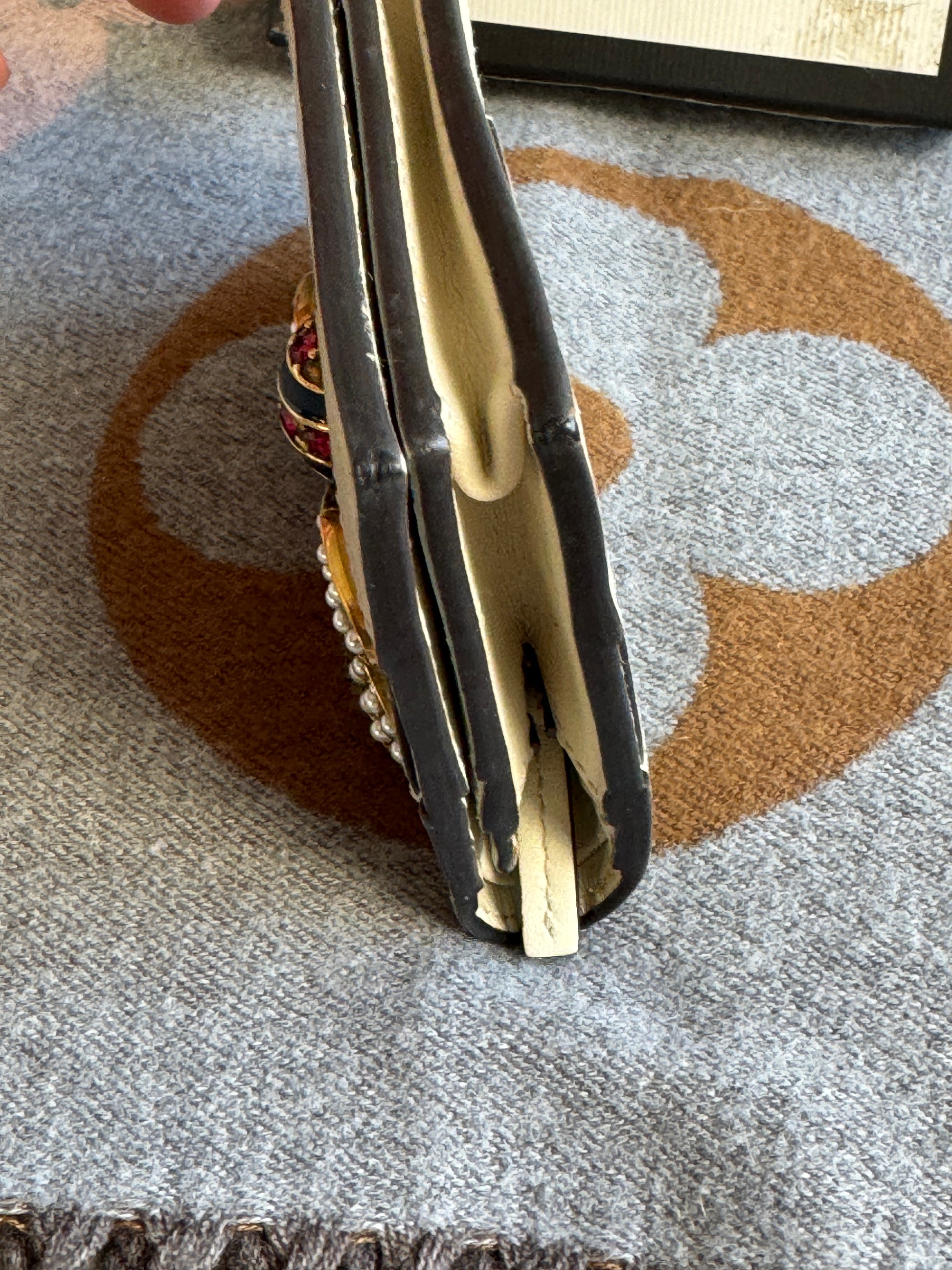 - Hardware: The snap closure operates properly. Embellishment and Logo is gold and shiny, no missing stones/pearls.