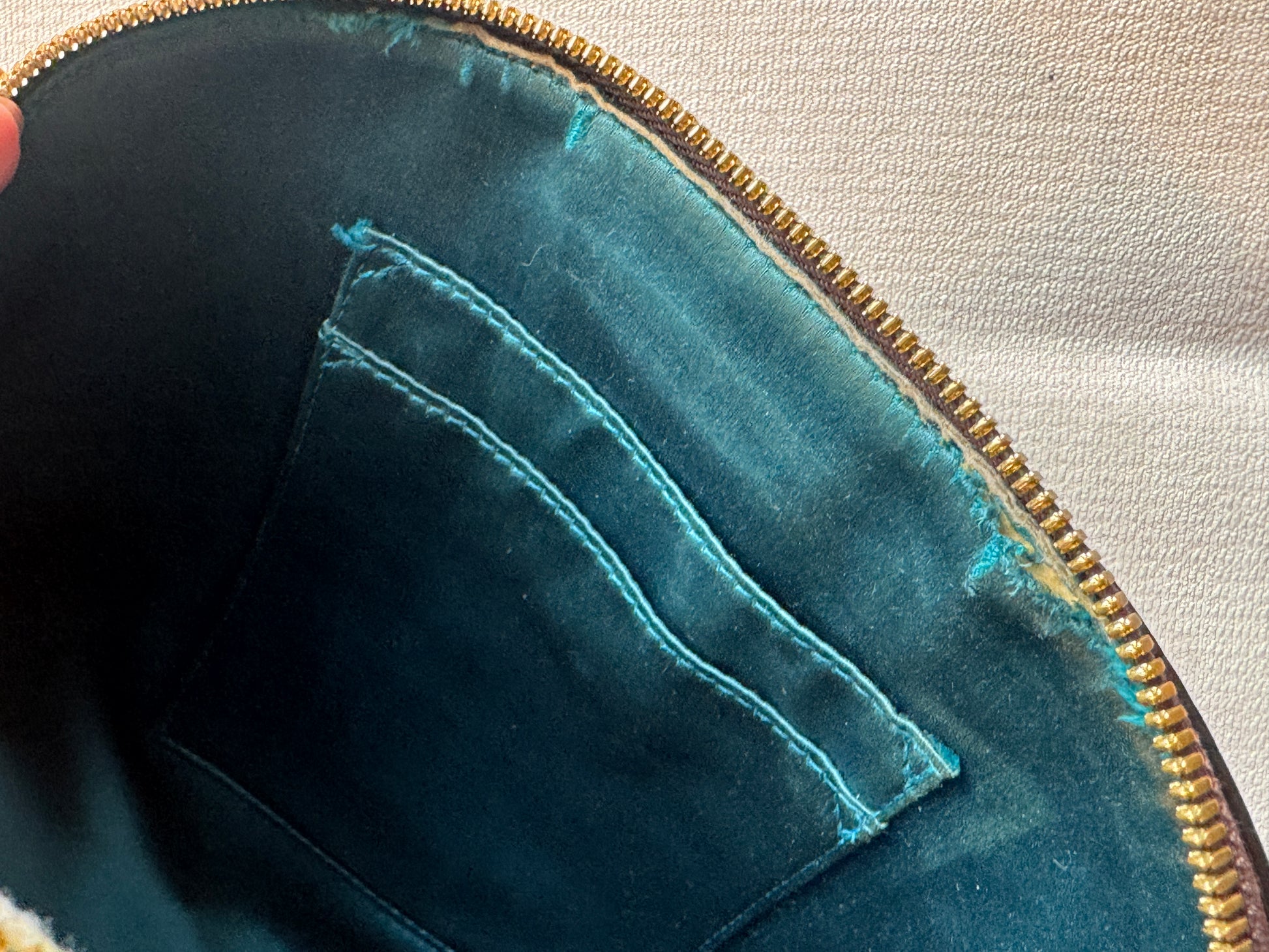 This bag is in good used condition. Corners have rubbing and wear. No odor, non smoking. No heavy stains. Lining has a tiny tear up by zipper/stitching. Hardware has signs of light use with tiny surface scratches. Zipper works properly with 1 slider. Strap is still stiff and excellent condition. Connections are all strong.