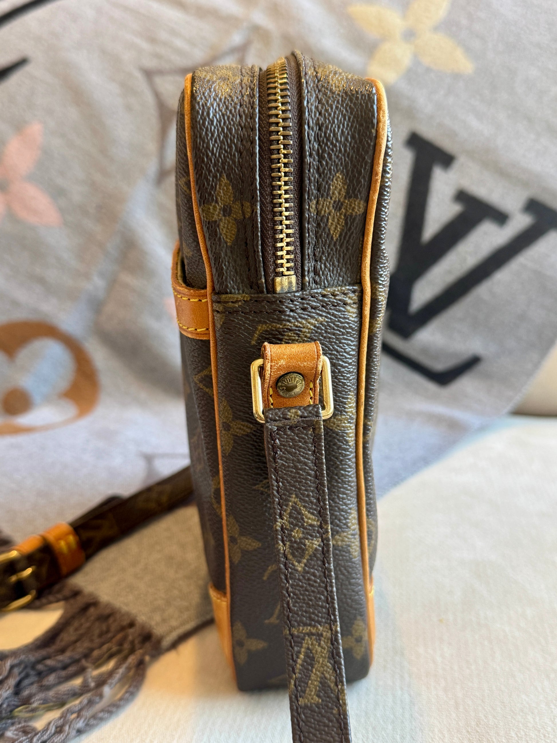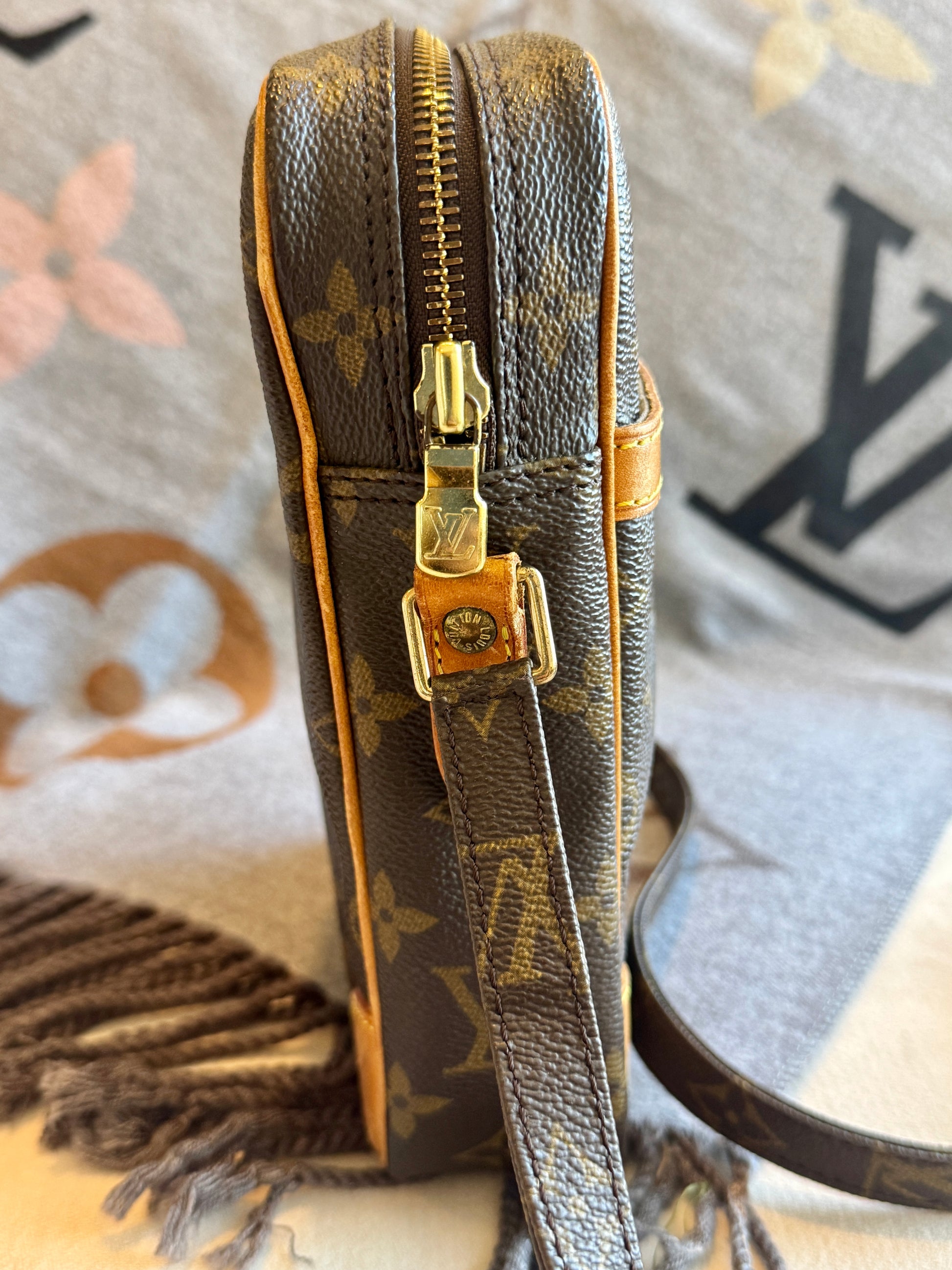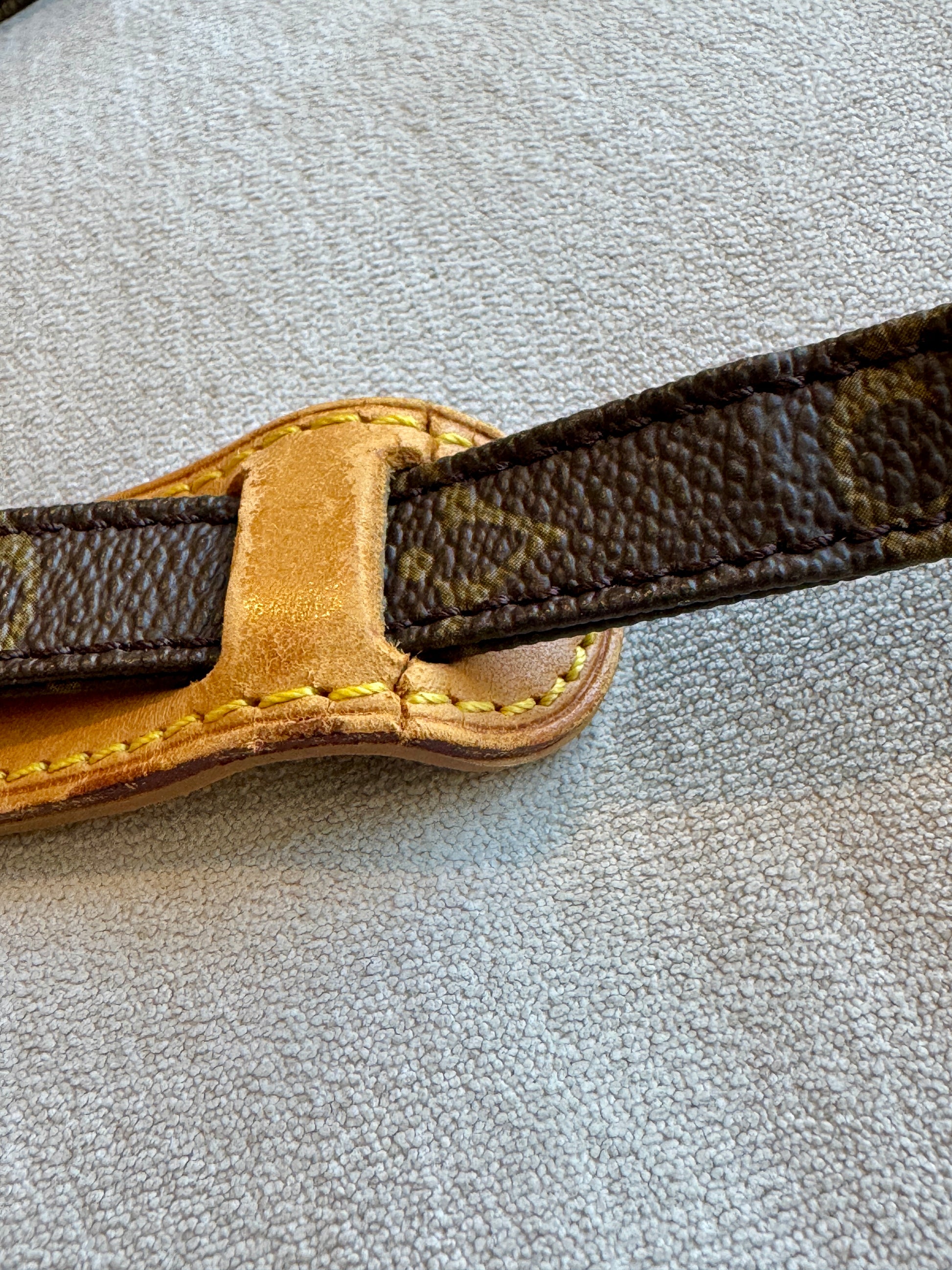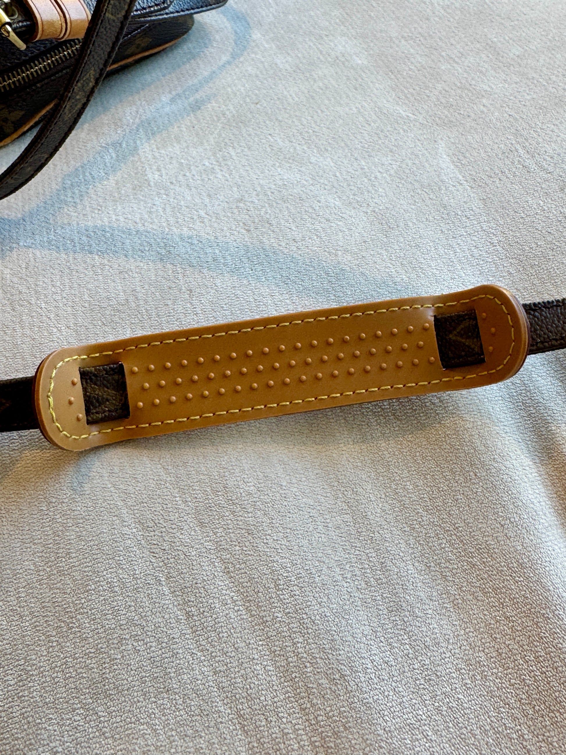 - Vachetta Leather: Honey patina with some light stains throughout. No exposed piping. Side chaps have no cracking and connections are very strong. Strap band has some cracking one one end. Doesn't effect the function and is still holding strong.