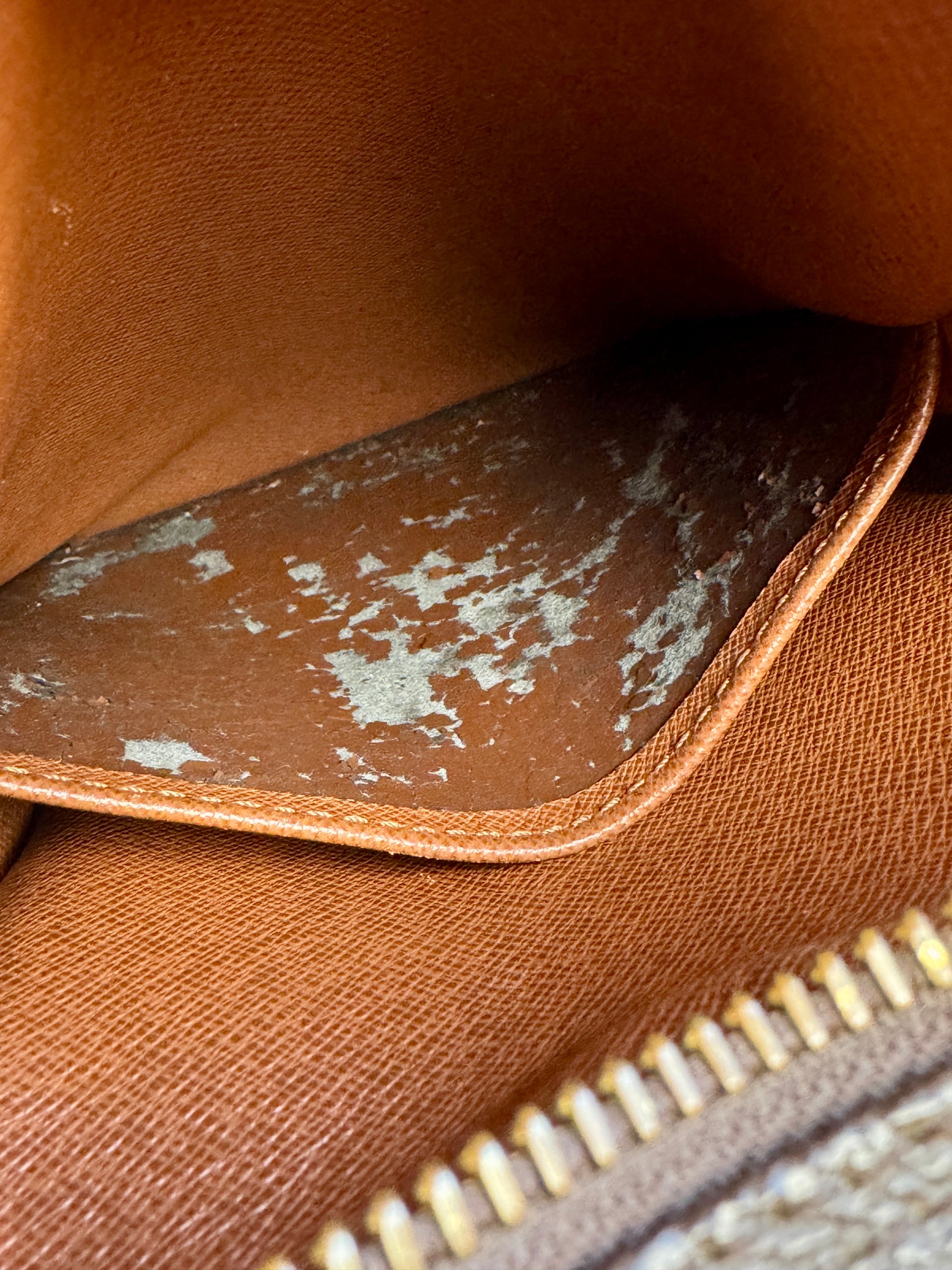 Hardware: Good still shiny/gold, some fading, scratches & tarnishing. Buckles and zippers work properly.