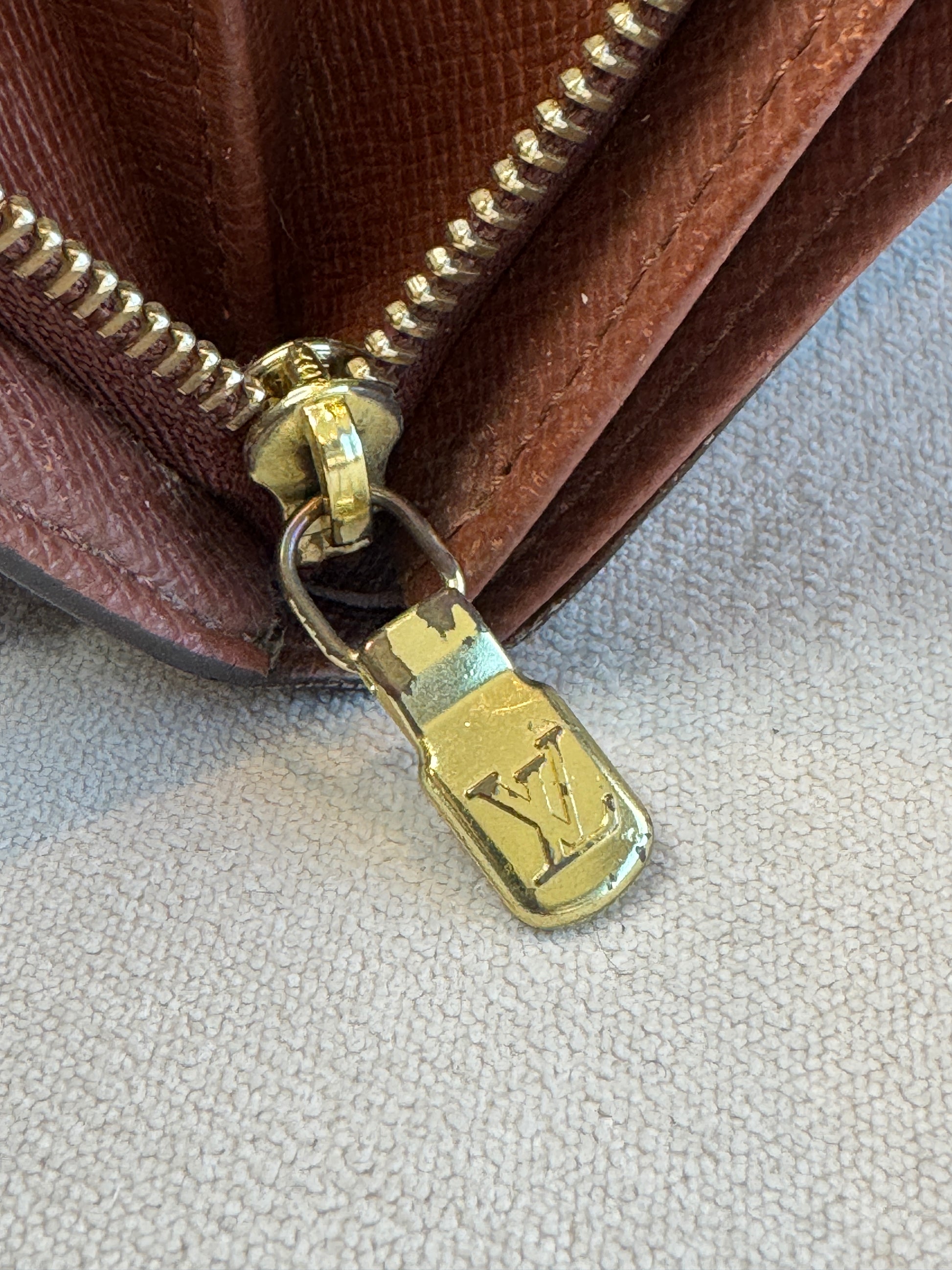 - Overall very good pre-owned condition. Print is still vibrant and clean. Few areas on print have a little fading on the back. Edging is very good. Eyelet was added on top edge from previous owner. Can be used as a chain wallet, or wristlet could be added. Hardware had normal signs of wear. Snap is strong and works good. Inside zippers runs smooth, & functions properly. Inside has light signs of use only. Card slots are still tight. No odor, no smoking.