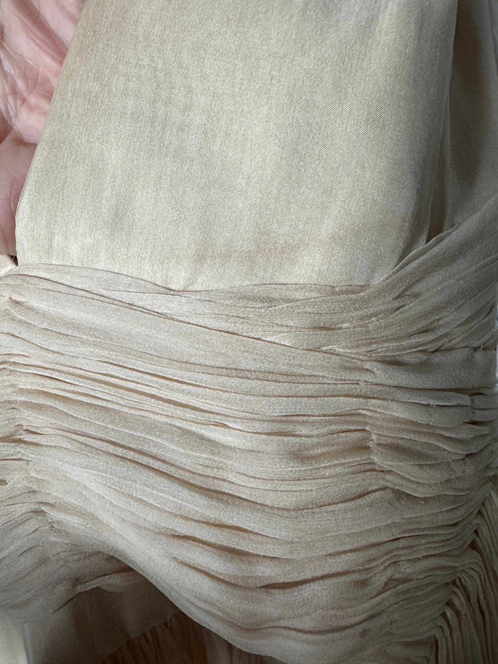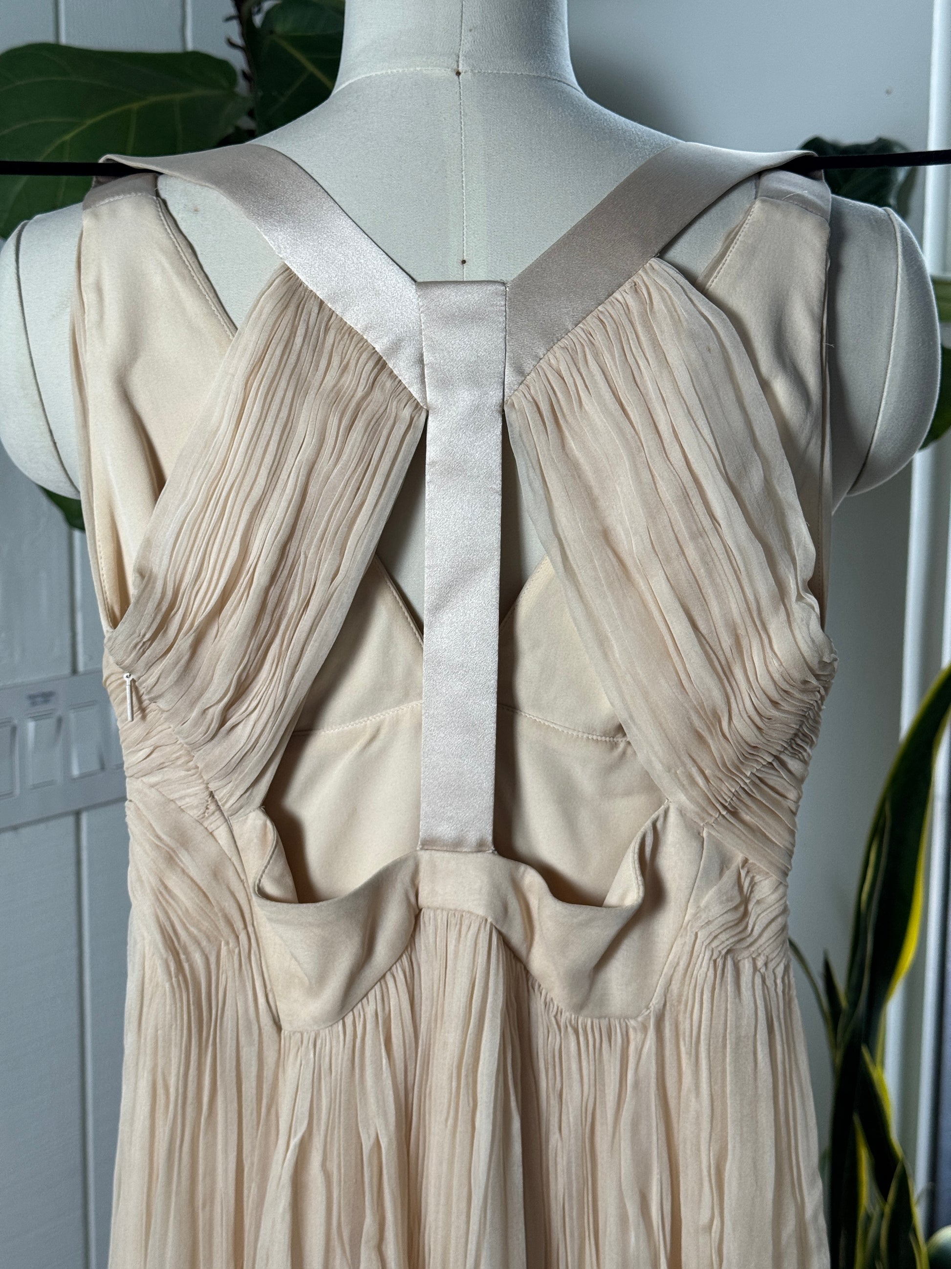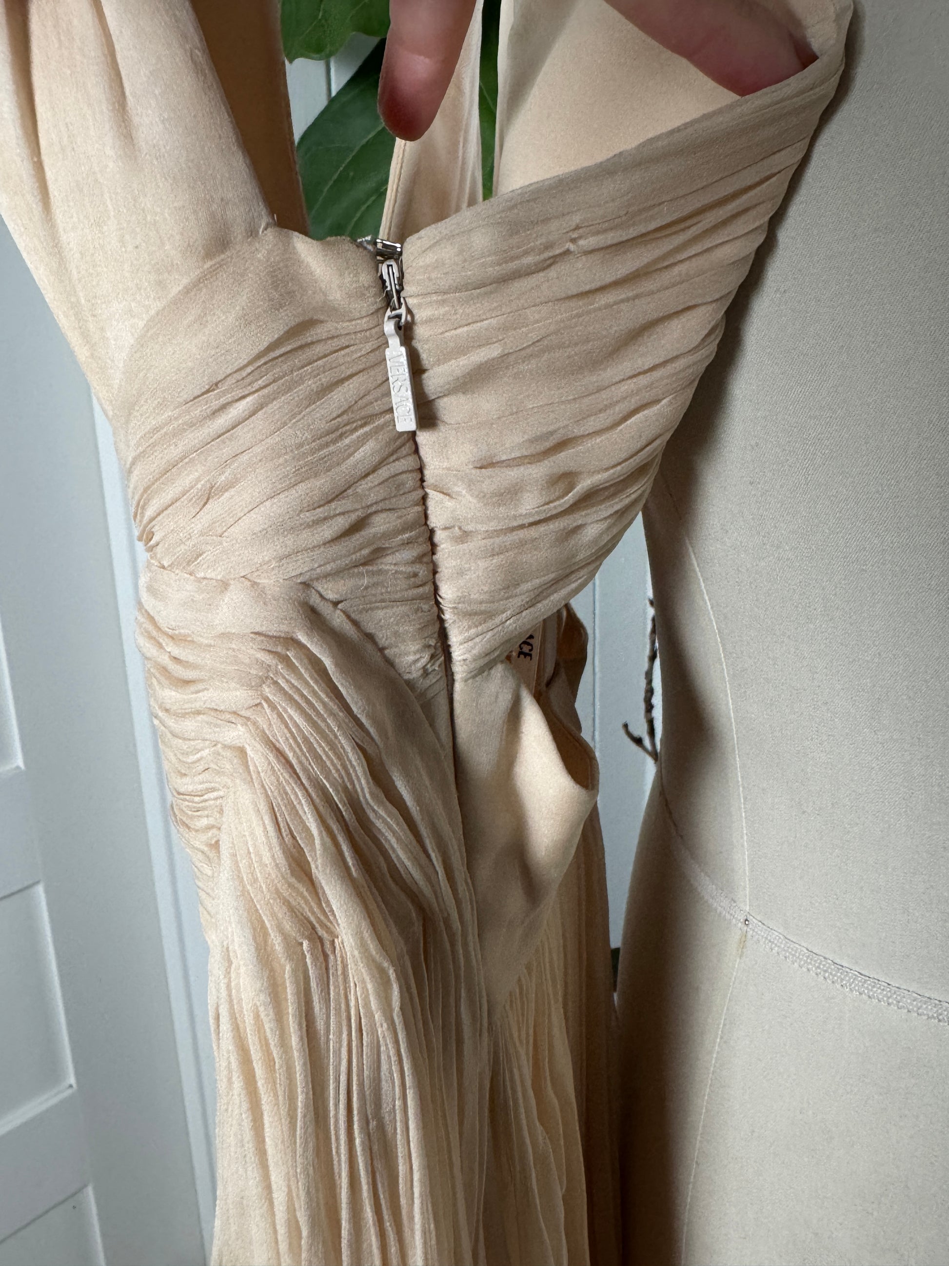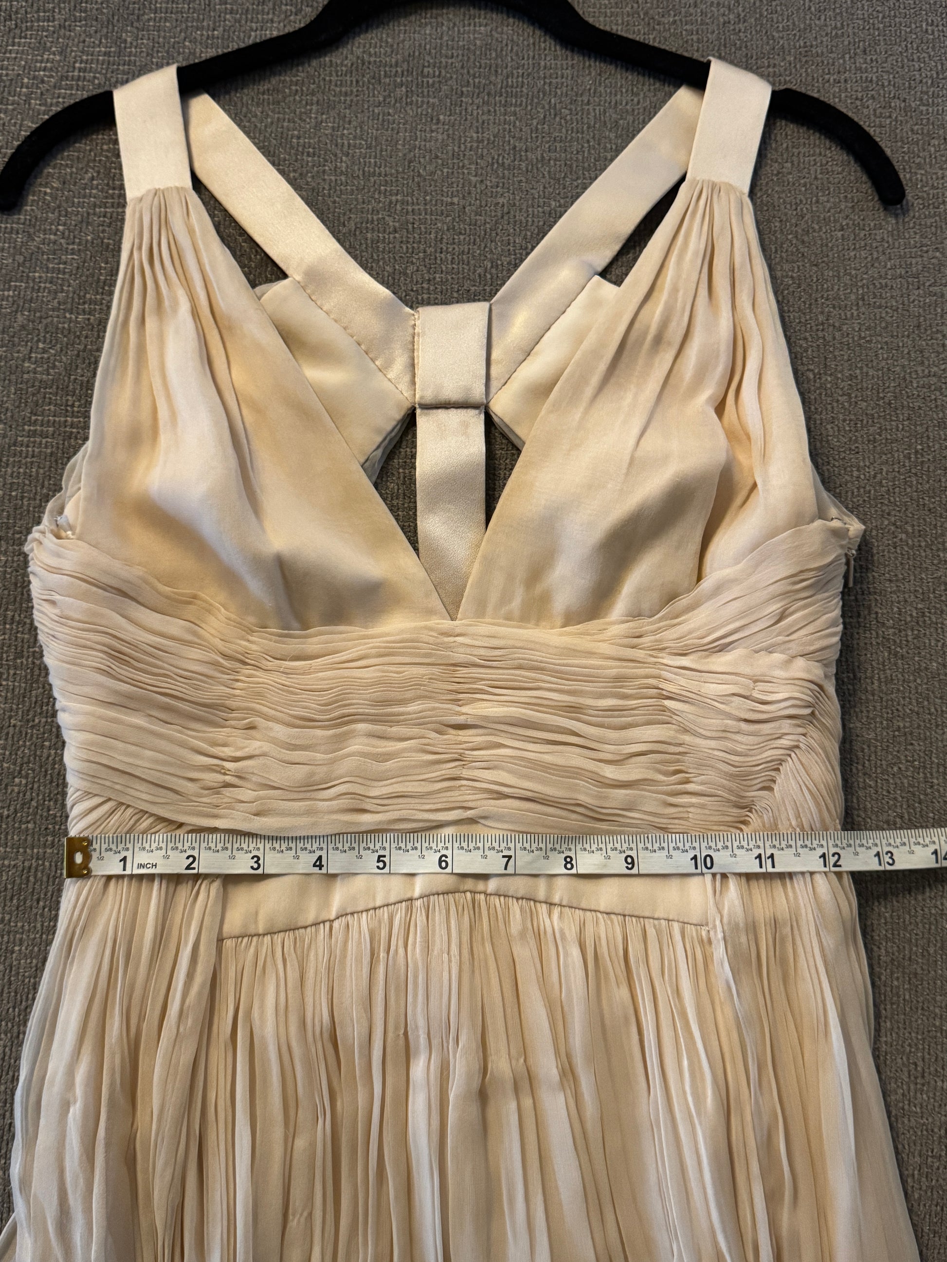 This gown is unworn but has a few small spots (can be dry cleaned). There are a few loose threads and snags here and there but you cannot see them with all the tucks and pleats. Perfect for a special event, wedding, party, evening affair.